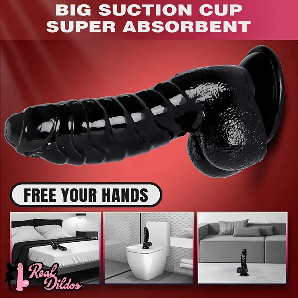 6.88in Glossy Black Monster Penis PVC Uncut Adult Toy Wave Texture